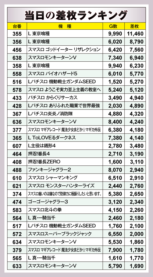 上位を席巻したのは『L 東京喰種』。355番台が+11,460枚と万枚を達成し、356番台も+8,790枚とつづく。そして358番台が+6,230枚と、圧倒的優秀台が多数ランクインしている。