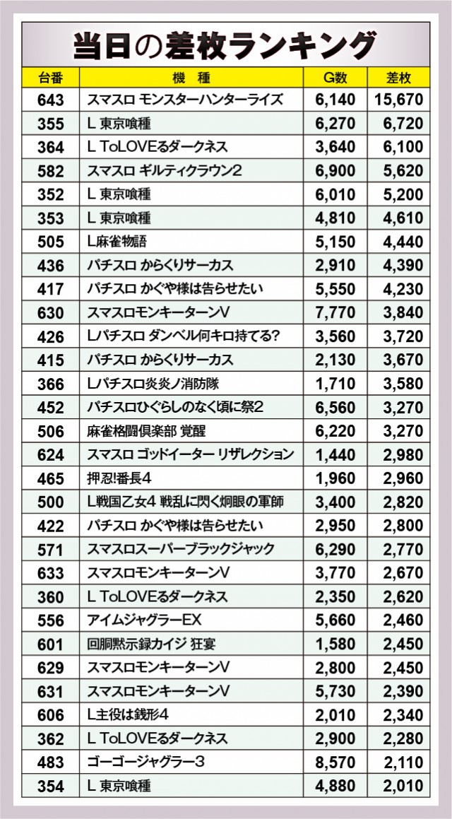 ※差枚数順に掲載しています。