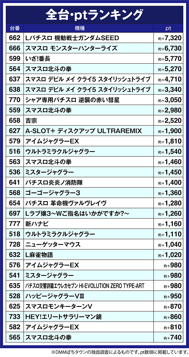 ほかにも、「ミスタージャグラー」や「ゴーゴージャグラー3」、「ウルトラミラクルジャグラー」などに約+1,110ptを超えた台があった。