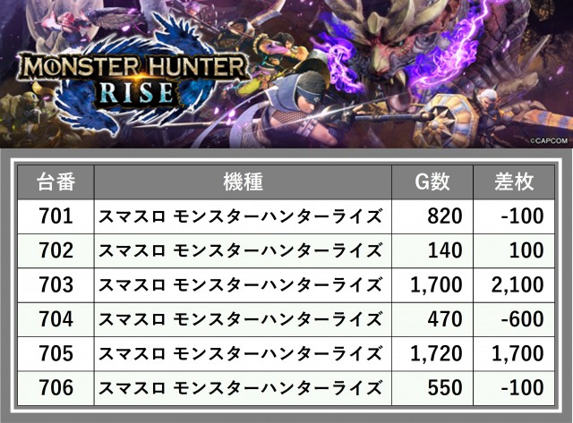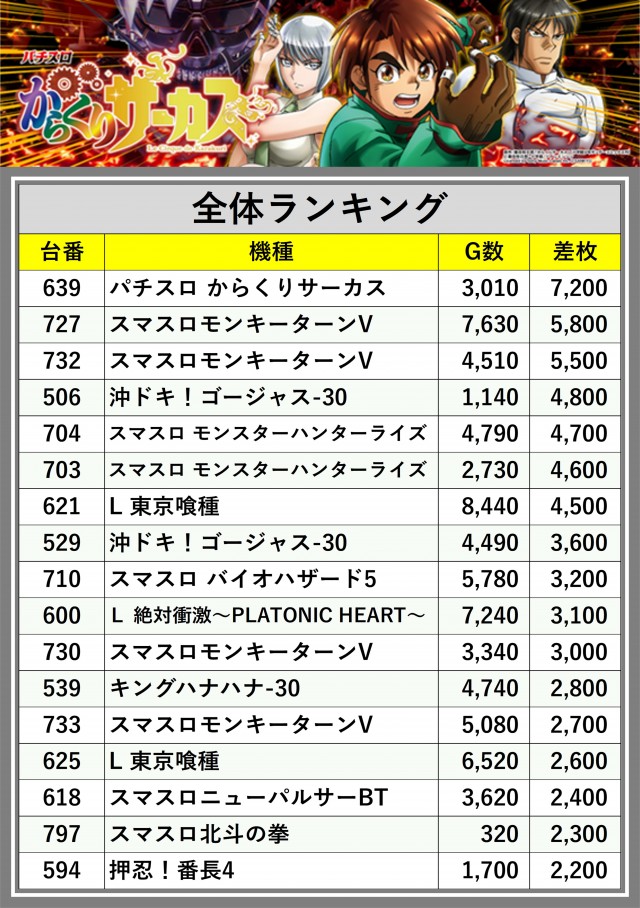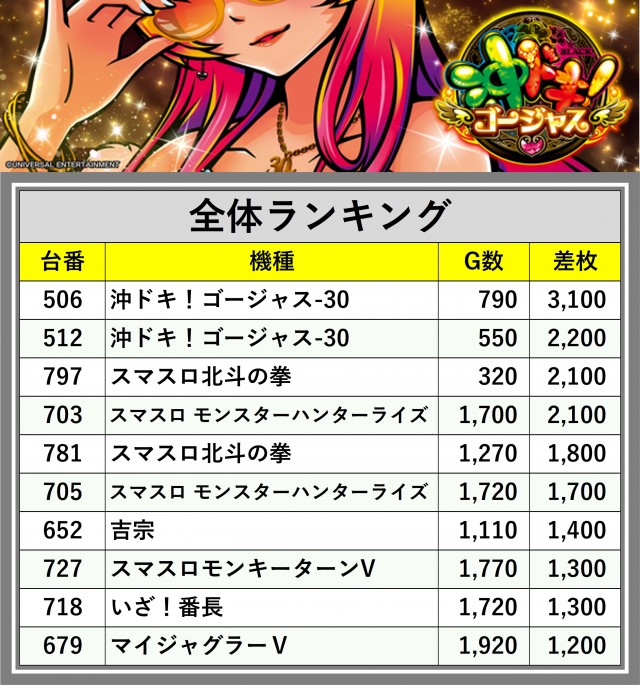 厳選された取材対象機種をはじめ、その他スロット全体から好記録が飛び出した!プレイヤーが楽しんだ1日を下記データにて振り返ってみて欲しい。
