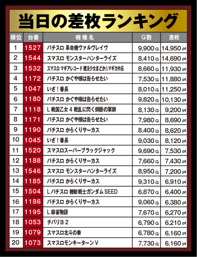 この日のSAPグループはひと味違う。DMMぱちタウンは、「SAP草加店」の特別なひとときを一斉取材した。特に華々しい活躍を残した機種たちをピックアップして紹介しよう。まずは差枚ランキングの発表だ!