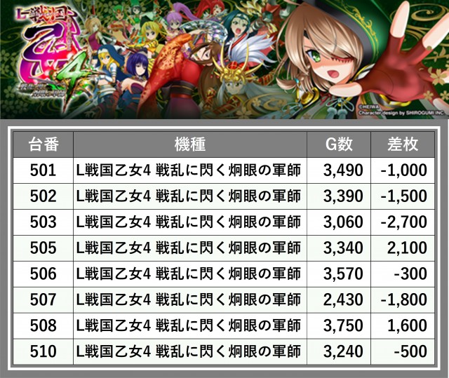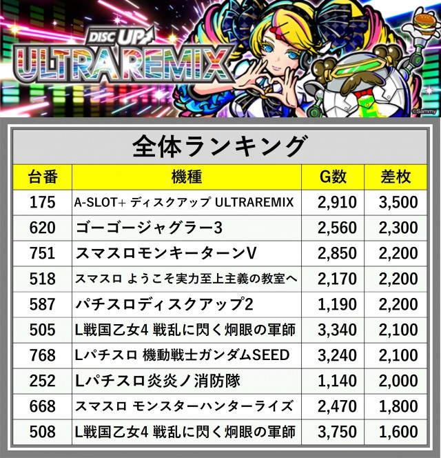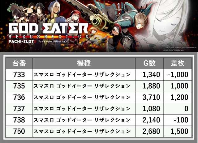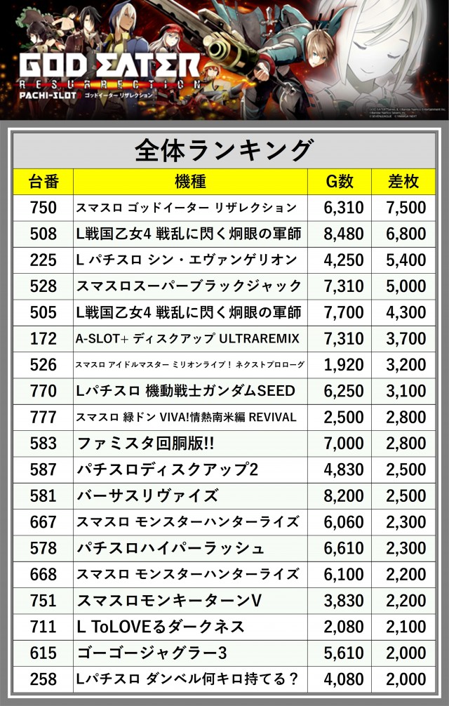 厳選された取材対象機種をはじめ、その他スロット全体から好記録が飛び出した!プレイヤーが楽しんだ1日を下記データにて振り返ってみて欲しい。