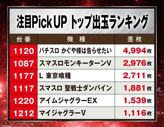 また、その他の機種では『スマスロモンキーターンV』と『L 東京喰種』が2,000pt超を記録。さらに、ジャグラーシリーズからも好調台が確認されており、広範囲に渡ってしっかりとチャンスが潜んでいたのは間違いないだろう。