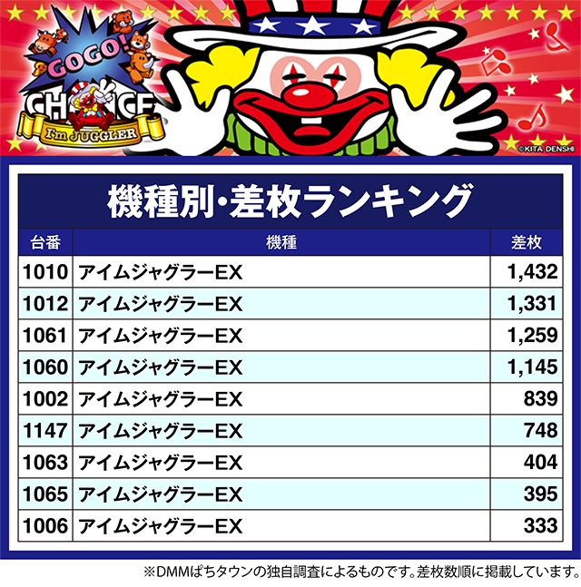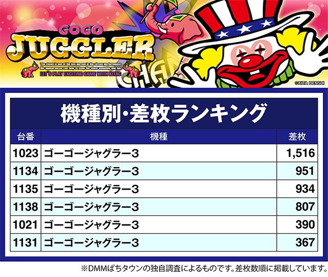 「ゴーゴージャグラー3」も6台がプラスとなり、1023番台は1,500ptオーバー。