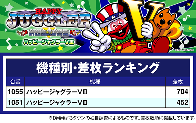 「ハッピージャグラーVⅢ」では、1051番台と1055番台がプラス。