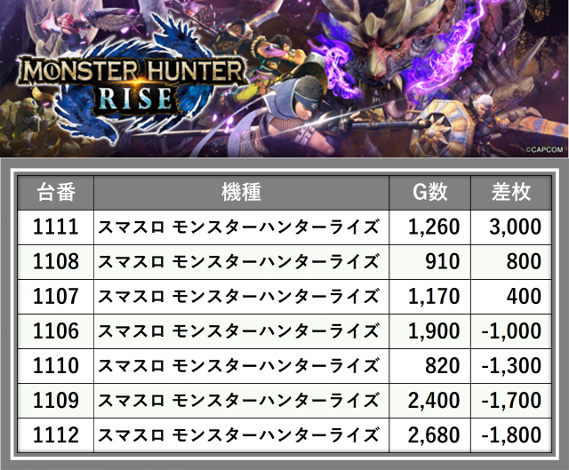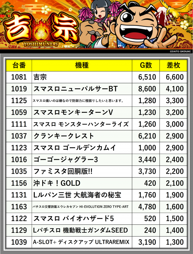 厳選された取材対象機種をはじめ、その他スロット全体から好記録が飛び出した!プレイヤーが楽しんだ1日を下記データにて振り返ってみて欲しい。