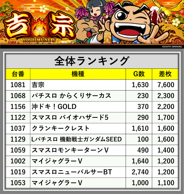 ※差枚数順に掲載しています