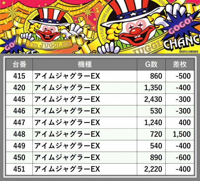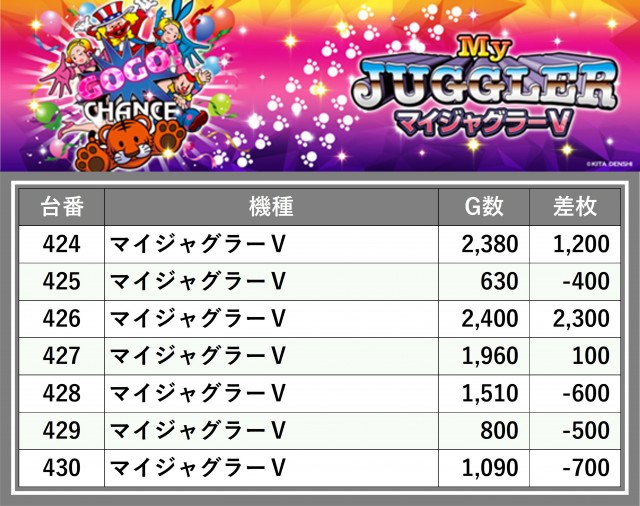 厳選された取材対象機種をはじめ、その他スロット全体から好記録が飛び出した!プレイヤーが楽しんだ1日を下記データにて振り返ってみて欲しい。
