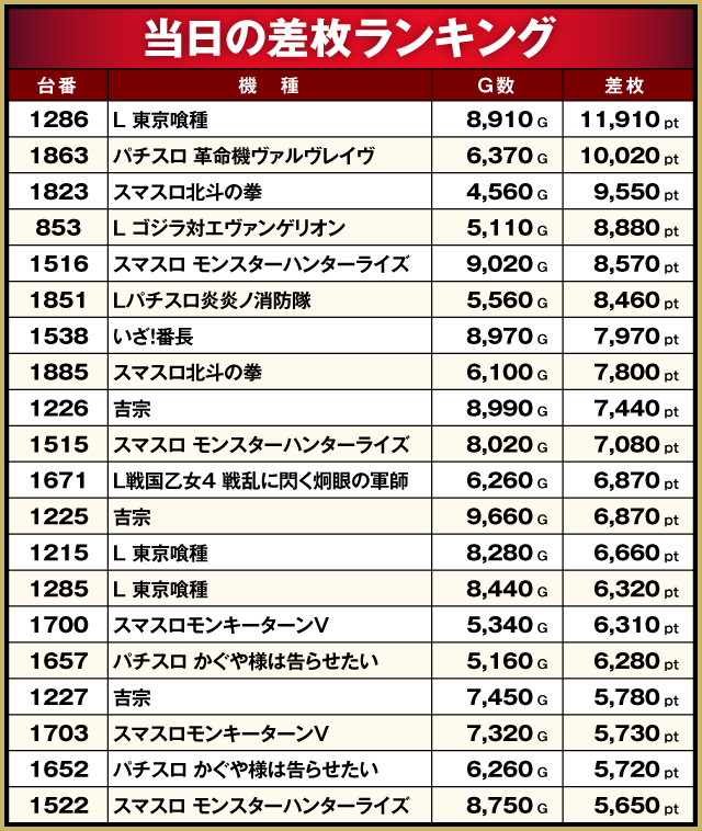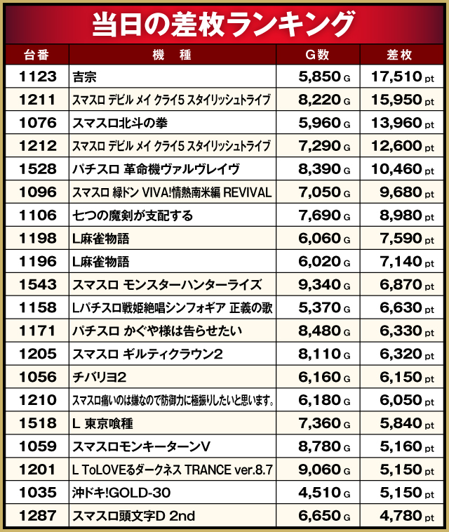 取材レポートでは両店の差枚ランキングと、華々しい結果の中から今回は独自に選定した5機種の記録に注目してほしい。