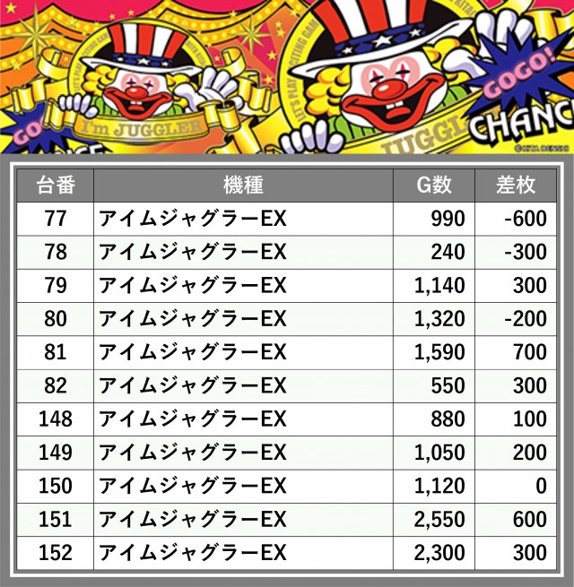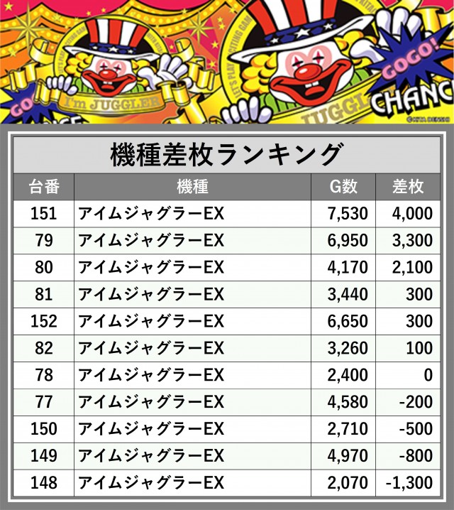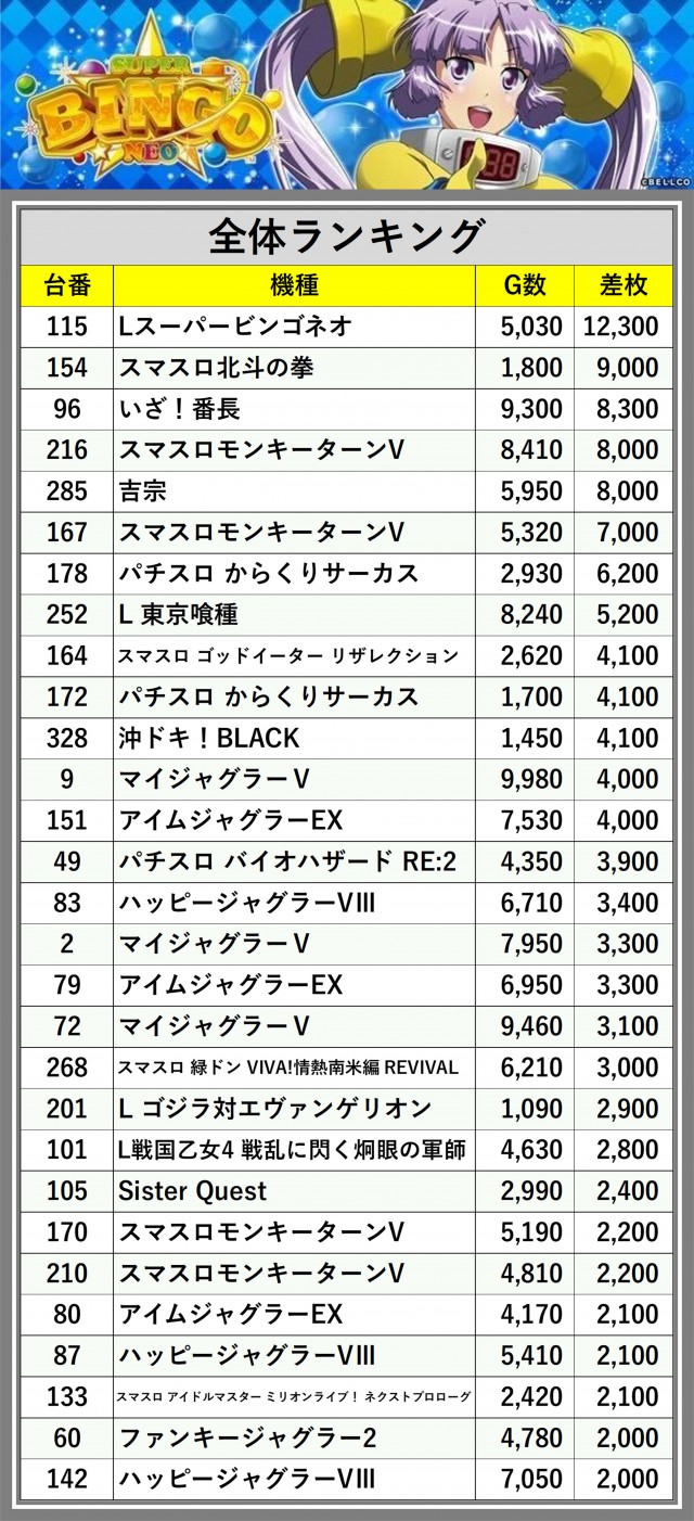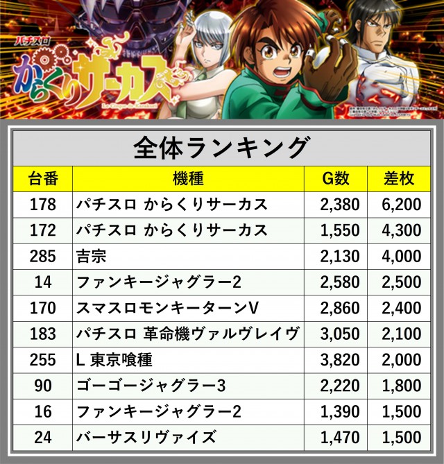 厳選された取材対象機種をはじめ、その他スロット全体から好記録が飛び出した!プレイヤーが楽しんだ1日を下記データにて振り返ってみて欲しい。