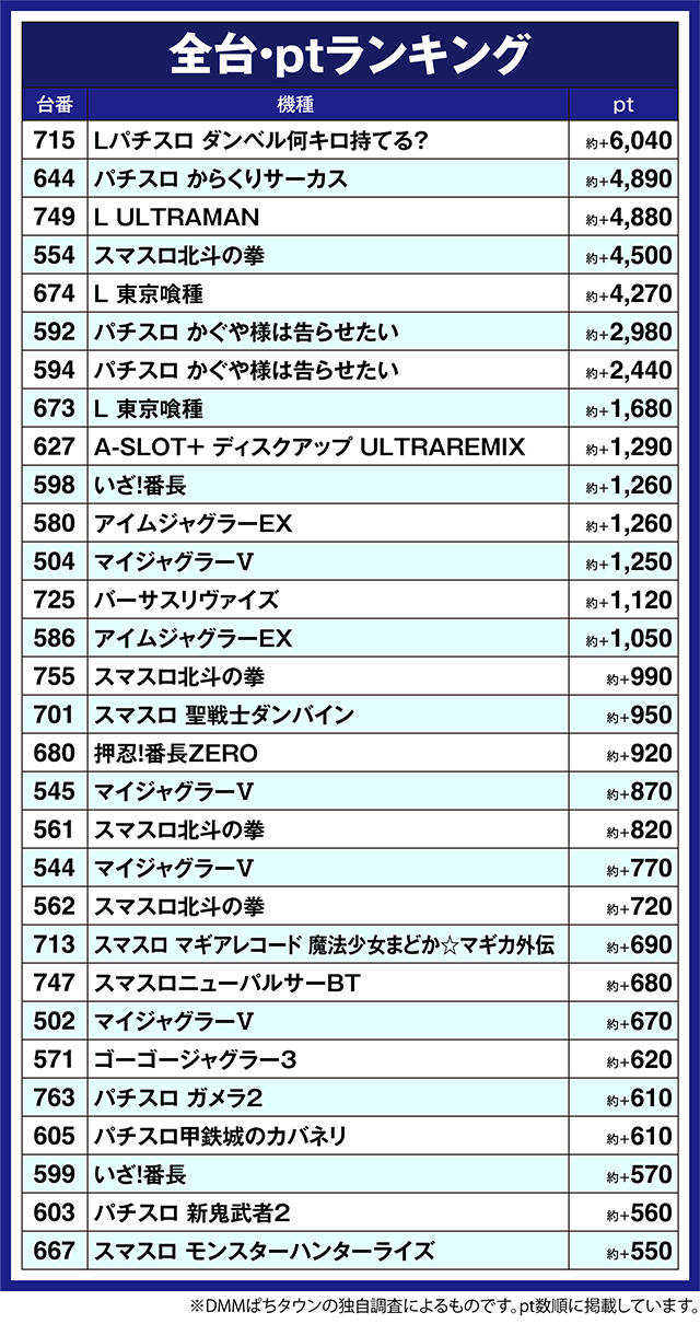 「パチスロ からくりサーカス」の644番台と「L ULTRAMAN」の749番台も約+4,800pt以上となった。