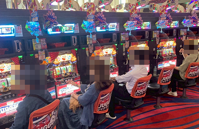 14時半をまわった頃の「マイジャグラーⅤ」は、大勢のプレイヤーが遊技中。