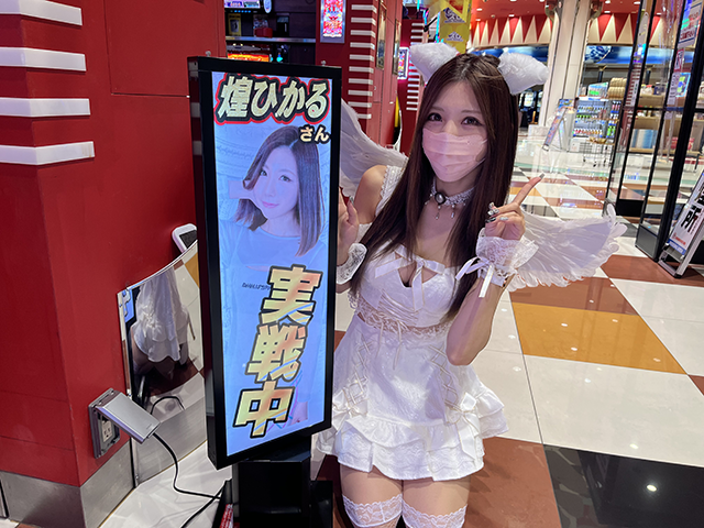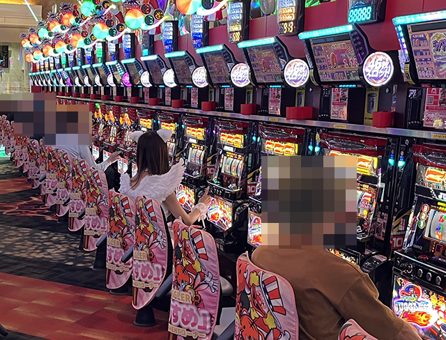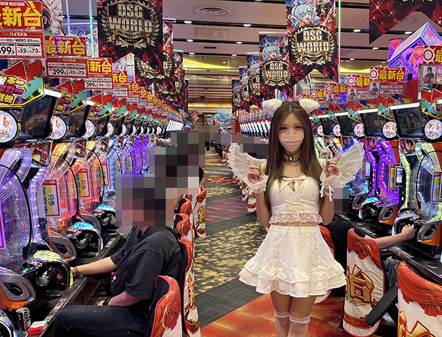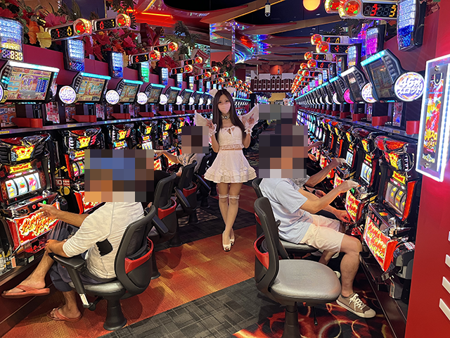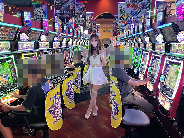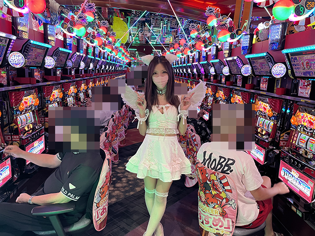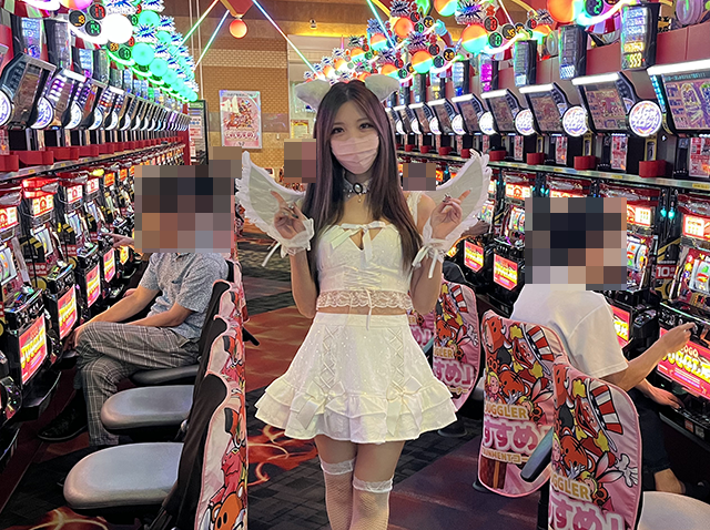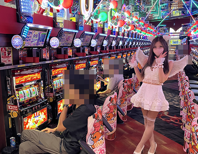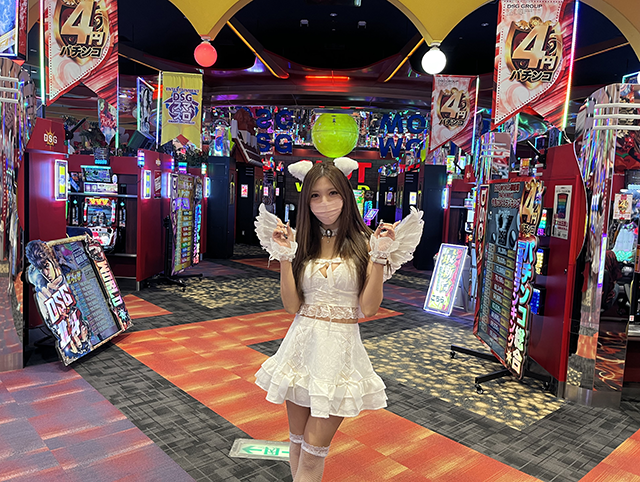 かわいらしい衣装を着て、まずはパチスロコーナーをまわりましょうヽ(*´∀`*)ノ