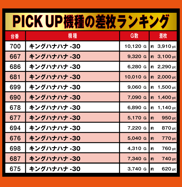 『キングハナハナ-30』は37台中13台がプラスpt。1万G回された700番台の+3,910ptを筆頭に+1,000ptオーバーが多数誕生していた。