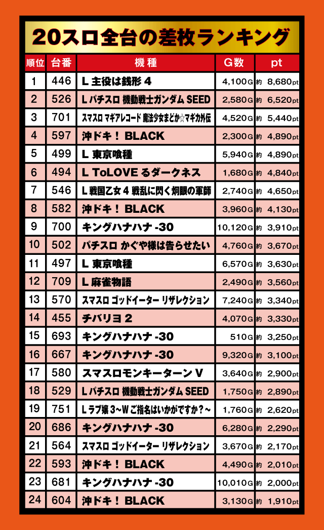 もっとも目立っていたのは『L主役は銭形4』446番台で、+8,680ptとなった。そして『Lパチスロ 機動戦士ガンダムSEED』526番台が+6,520pt、『スマスロ マギアレコード 魔法少女まどか☆マギカ外伝』701番台が+5,440ptとつづいている。以下『沖ドキ!BLACK』597番台の+4,890ptなどなど、優秀台が並ぶ壮観なデータとなっていた。