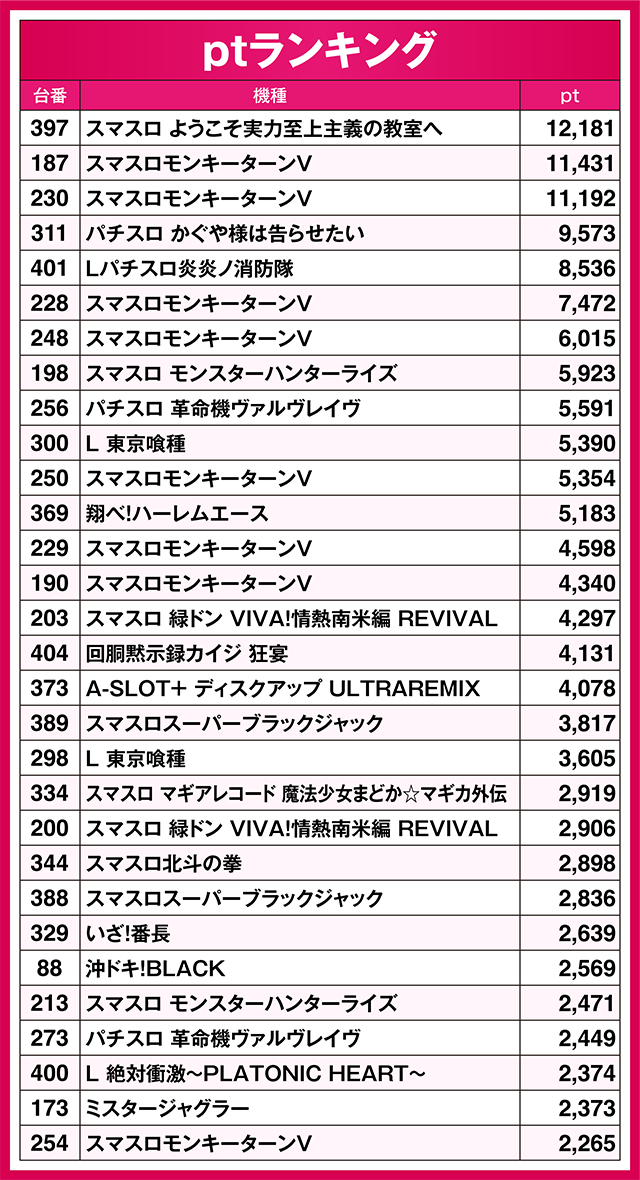 「パチスロ かぐや様は告らせたい」の311番台は9,573pt、「Lパチスロ炎炎ノ消防隊」の401番台も8,536ptと、多くの台が好結果となりましたよっ(⌒▽⌒)