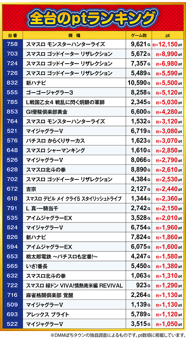 5台が約+1,000ptを超え、約+3,000ptを上回った台もあった。