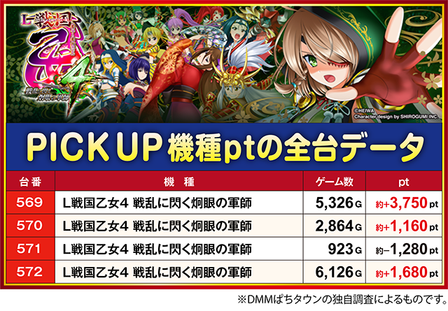 3台が約+1,100ptを上回った「L戦国乙女4 戦乱に閃く炯眼の軍師」でも、約+3,700pt以上となった台を確認した。