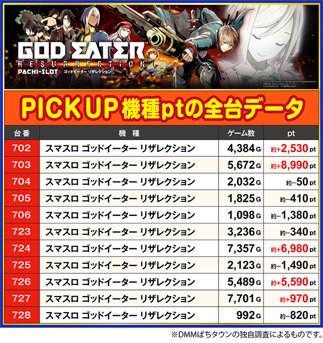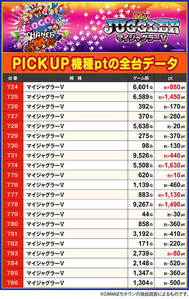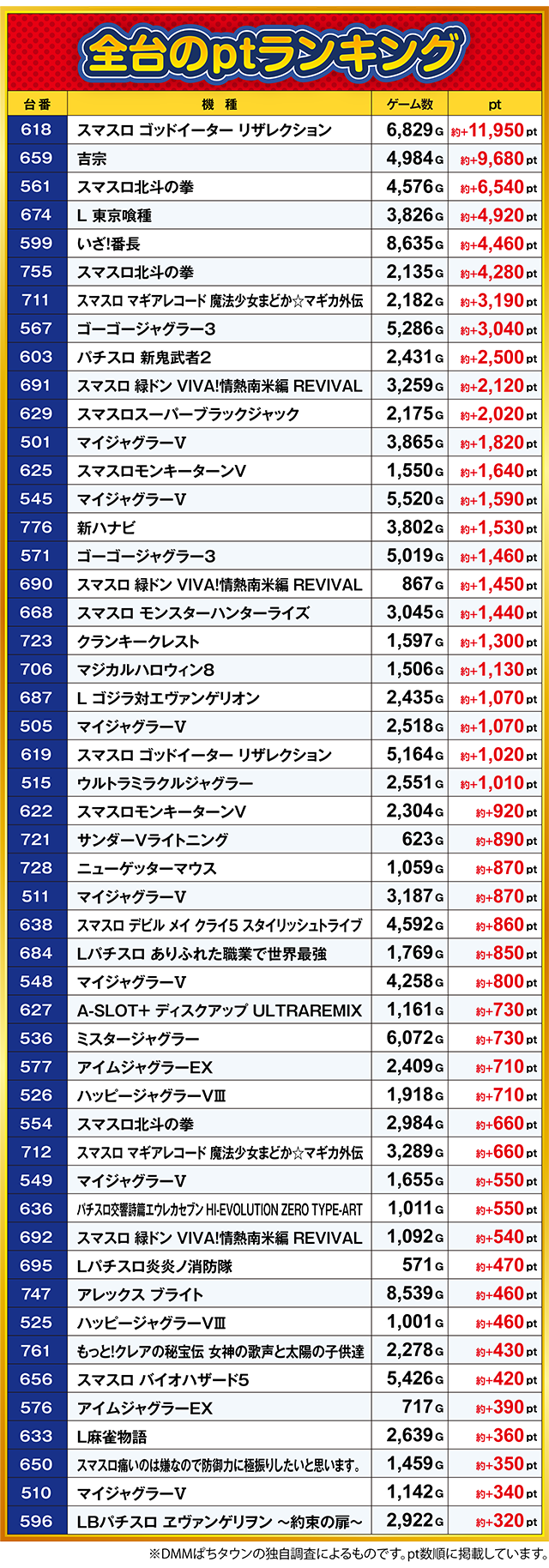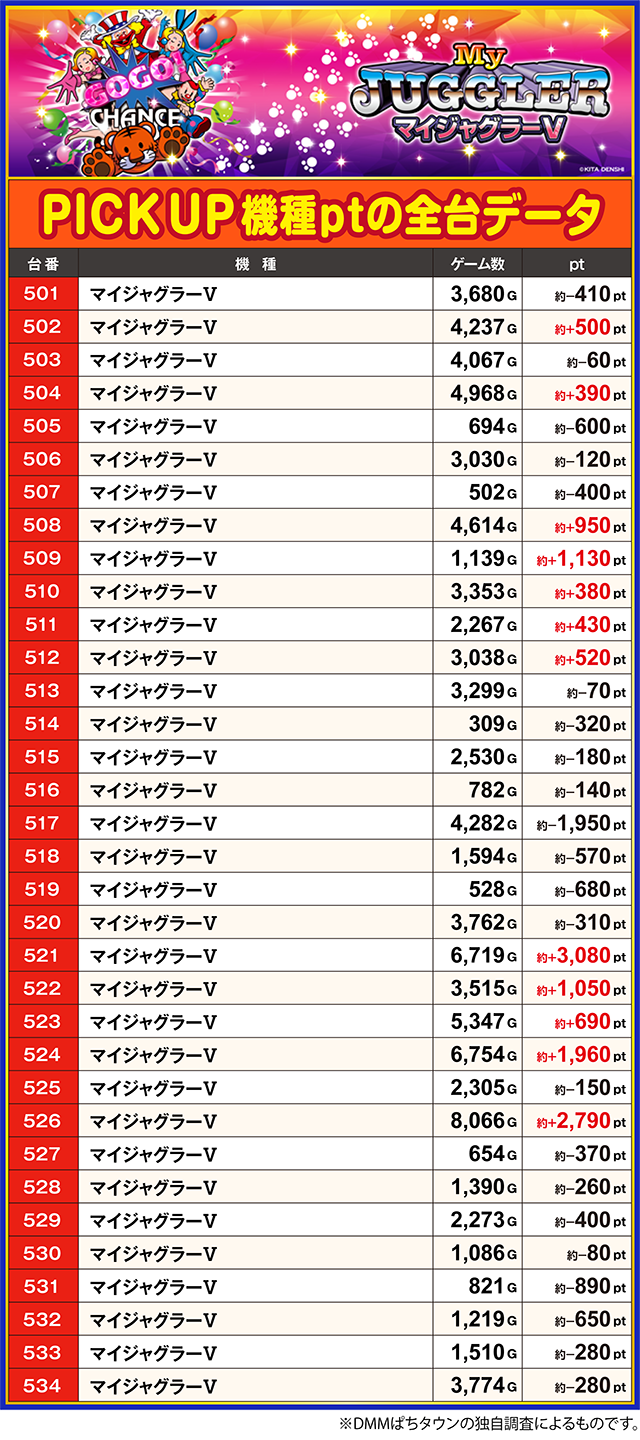 5台が約+1,000ptを超え、約+3,000ptを上回った台もあった。