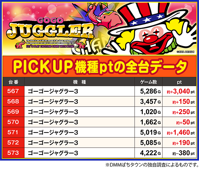 「グランパ三方原」も活気があり、「ゴーゴージャグラー3」の567番台が約+3,000ptオーバー。
