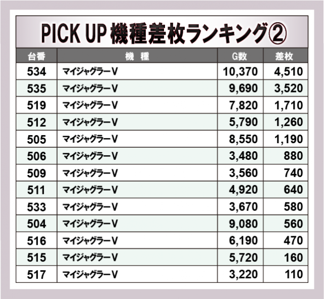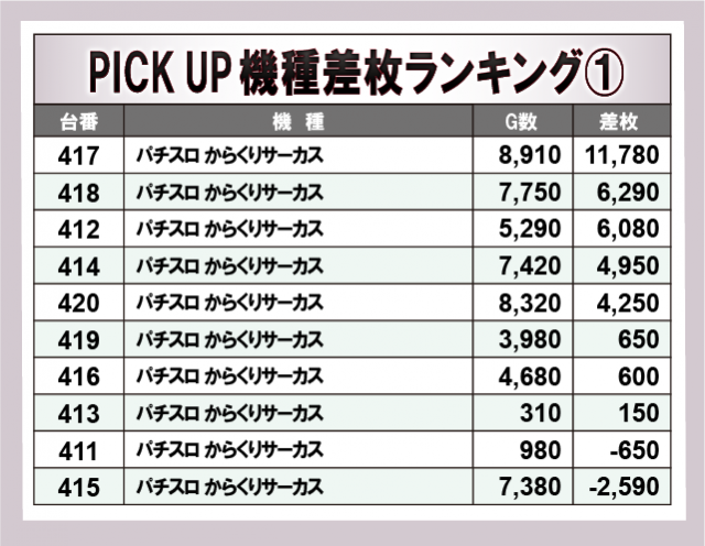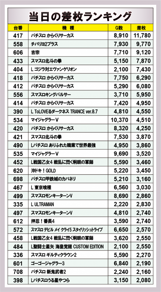 当日盛り上がりをみせていたのが上表の5機種だ。特に『パチスロ からくりサーカス』『マイジャグラーⅤ』は安定した結果を残し、大いに盛り上がりを見せていた!それだけでなく『Lパチスロ ありふれた職業で世界最強』『スマスロ バイオハザード5』からは全台プラス差枚数を達成しており、ファンを歓喜させた存在だったと言える。いずれも高い実力を発揮していたことが確認でき、しっかりと期待に応えていたと言えるだろう。