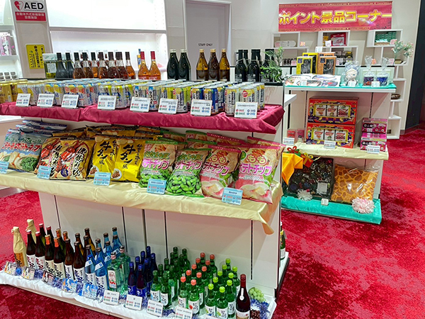 景品コーナーにはお酒類・お菓子・キャラクターグッズなど多彩なアイテムが揃っており、プレイヤーたちの目を引いていた。