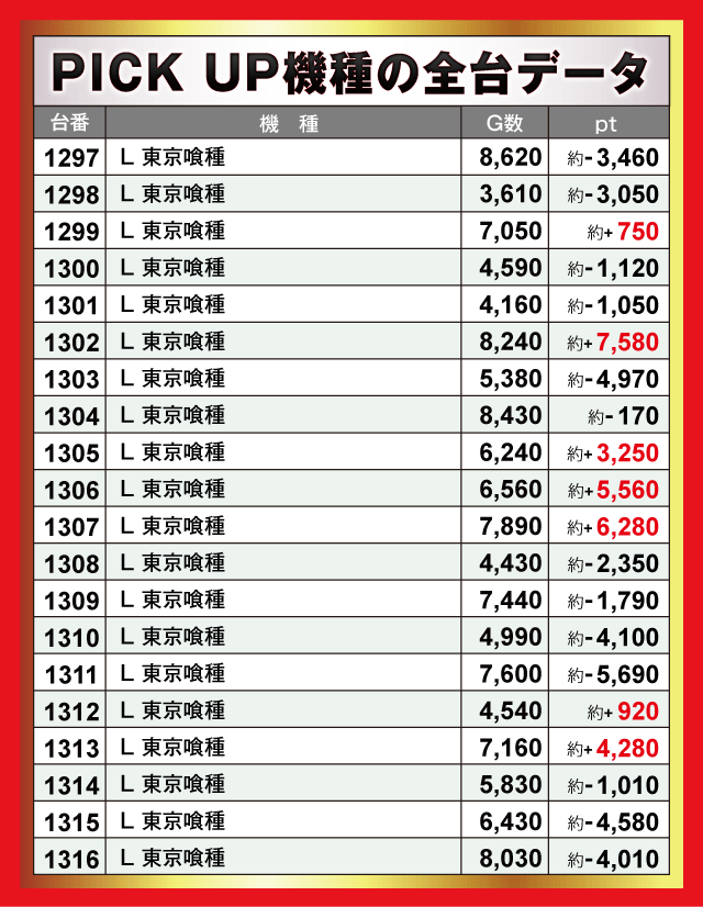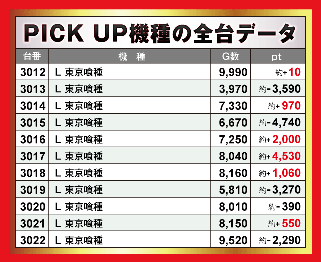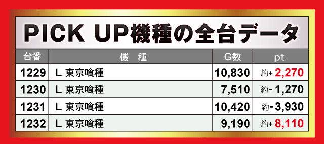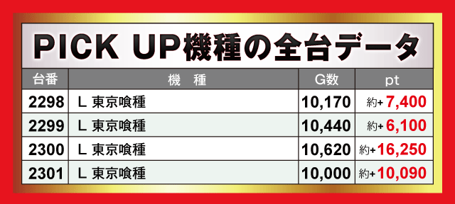 今回の全店共通PICK UP機種は『L 東京喰種』。全店舗の総台数は39台で、そのうちの半数以上の台がプラス差枚となる見事な結果を残している。しかも、+5,000pt超の好調台が大量発生しており、各店舗のシマは朝から晩まで活気に包まれる一日となった。