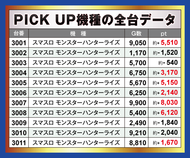 楽園上新屋店からは3017番台が+4,000pt超、3016番台が+2,000pt超といった好成績を確認。さらに、最終的に全11台のうち半数以上の台がプラス差枚となっている。