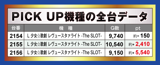 楽園沼津店で特に目立っていたのが『ハッピージャグラーVⅢ』で、全13台中11台がプラス差枚となる安定感を披露。また、『L 少女☆歌劇 レヴュースタァライト -The SLOT-』と『モンスターハンターライズ』からはともに+5,000pt超が確認されている。