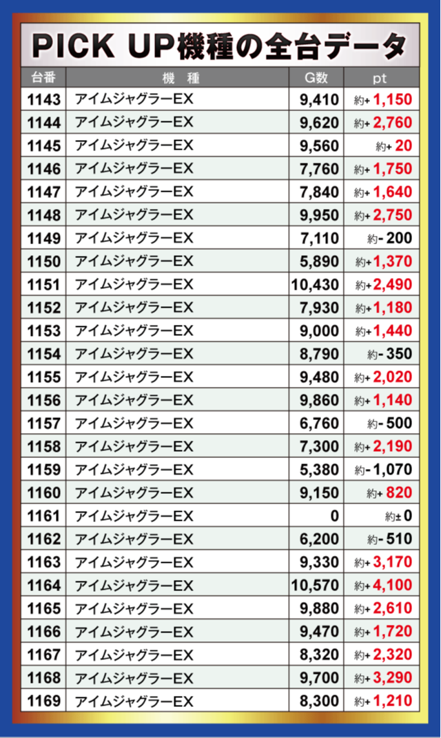 楽園沼津店は全台がプラス差枚となっている上に万枚超が2台も発生。また、残りの2台からも+6,000pt超が飛び出しており、平均差枚は4店舗でナンバー1の+9,000pt超を記録した。