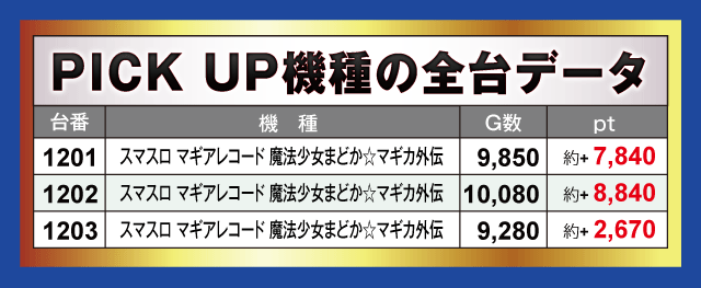 楽園袋井店は『スマスロ マギアレコード 魔法少女まどか☆マギカ外伝』をPICK UP。設置されている3台全てがプラス差枚となっているだけでなく、+8,000pt超、+7,000pt超といったハイスコアがしっかりと飛び出している点にも注目しよう。