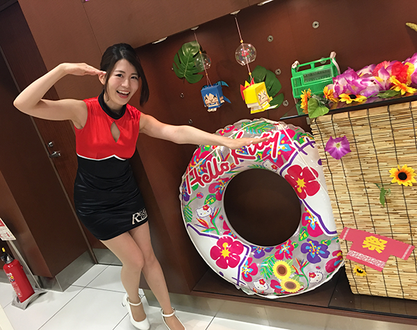 丁寧に清掃されているホール内には、浮き輪やヒマワリといった夏らしい装飾が多数。みゆちゃんもノリノリでポーズをきめてくれた。