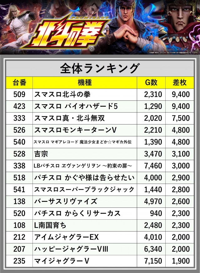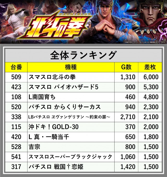厳選された取材対象機種をはじめ、その他スロット全体から好記録が飛び出した!プレイヤーが楽しんだ1日を下記データにて振り返ってみて欲しい。