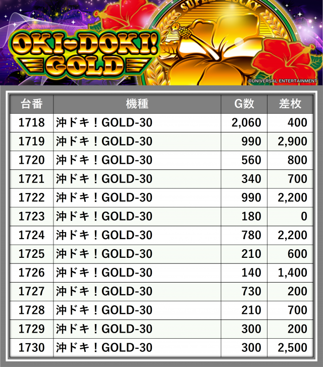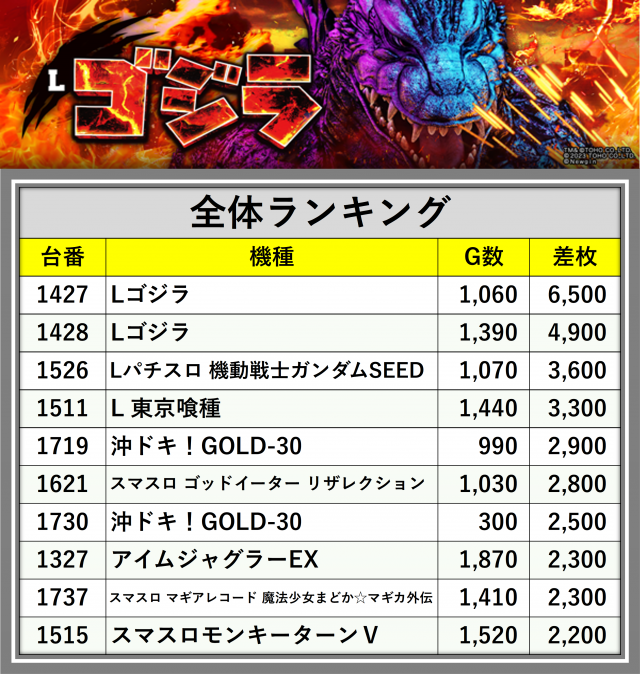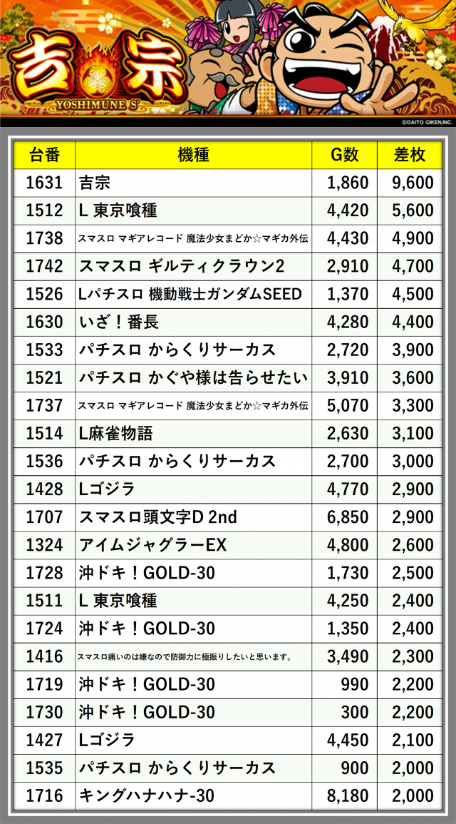 厳選された取材対象機種をはじめ、その他スロット全体から好記録が飛び出した!プレイヤーが楽しんだ1日を下記データにて振り返ってみて欲しい。