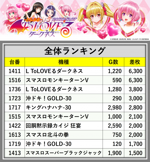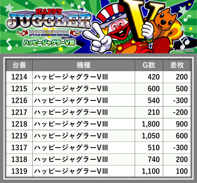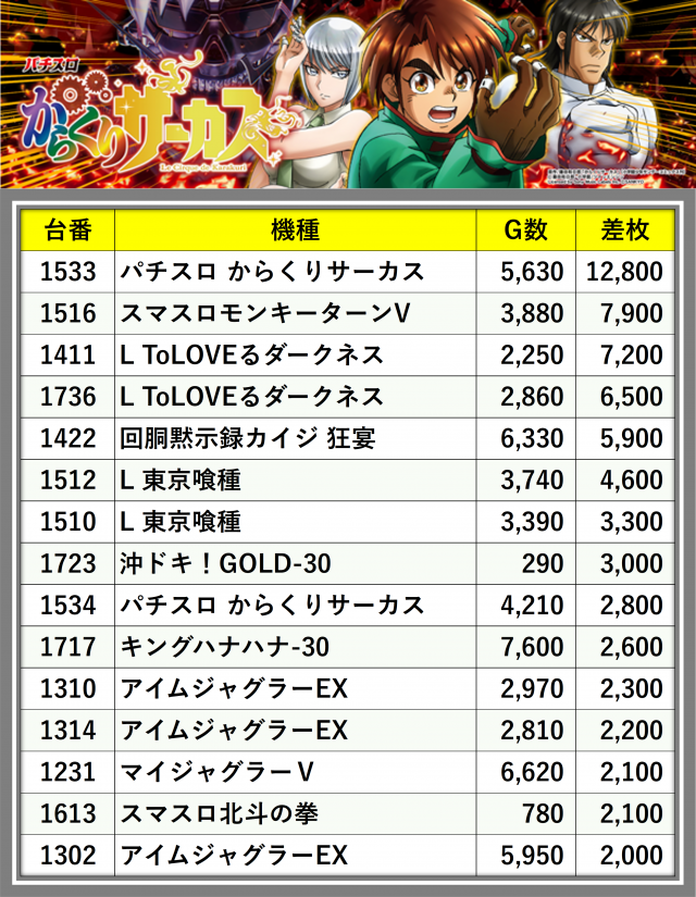 厳選された取材対象機種をはじめ、その他スロット全体から好記録が飛び出した!プレイヤーが楽しんだ1日を下記データにて振り返ってみて欲しい。
