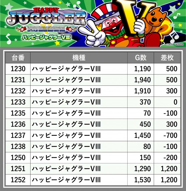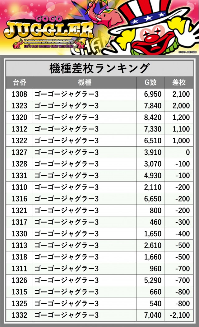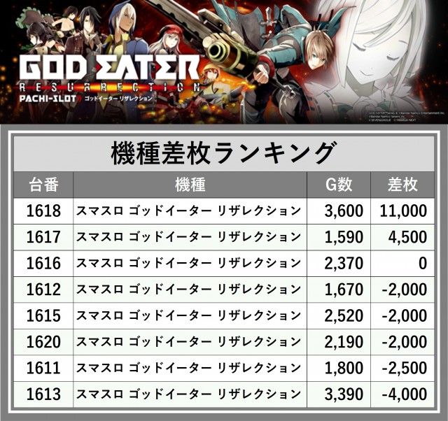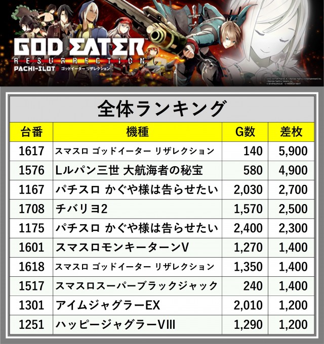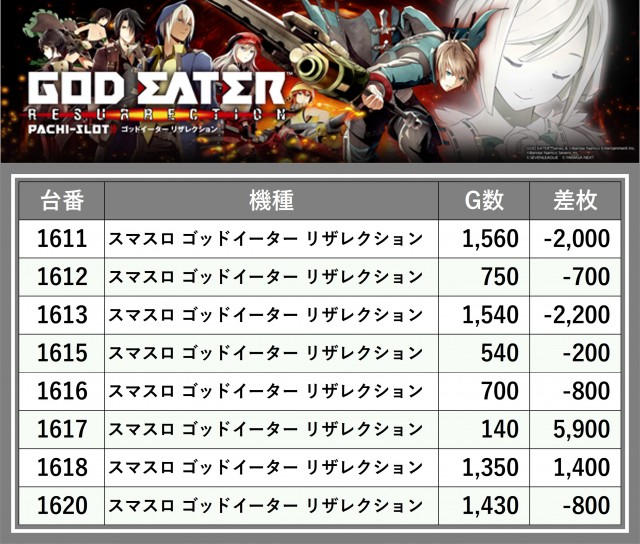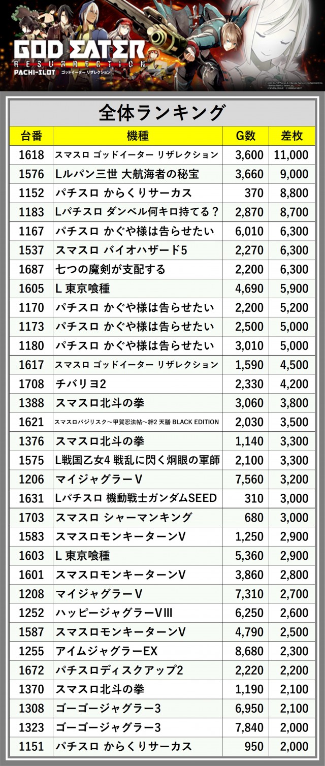 厳選された取材対象機種をはじめ、その他スロット全体から好記録が飛び出した!プレイヤーが楽しんだ1日を下記データにて振り返ってみて欲しい。