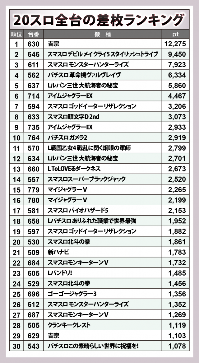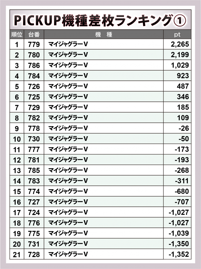 『マイジャグラーⅤ』21台では+2,000枚超が2台となったが、もうひと伸びとプラス率の高さが欲しいところだった。