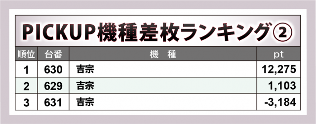 『吉宗』は3台中2台が勝利、630番台が+12,300枚弱でこの日の王座を射止めた。