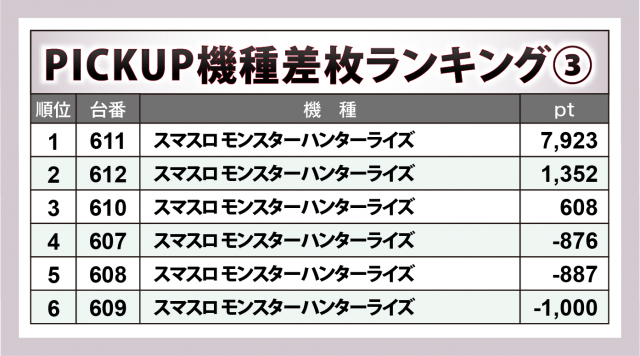 『スマスロ モンスターハンターライズ』4台ではピッタリ半分がプラスを収め、611番台が+7,900枚超を叩き出した。