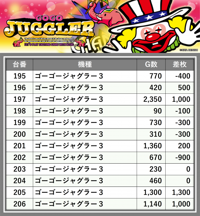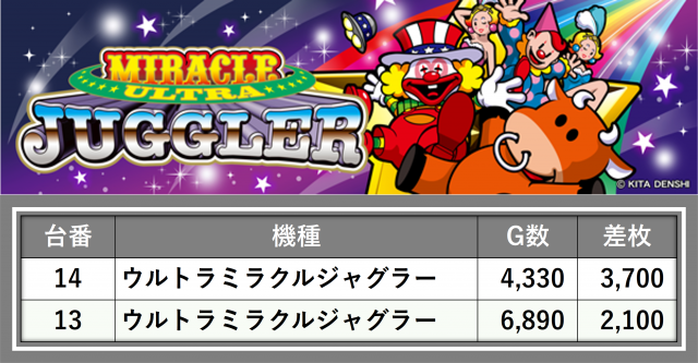 厳選された取材対象機種をはじめ、その他スロット全体から好記録が飛び出した!プレイヤーが楽しんだ1日を下記データにて振り返ってみて欲しい。