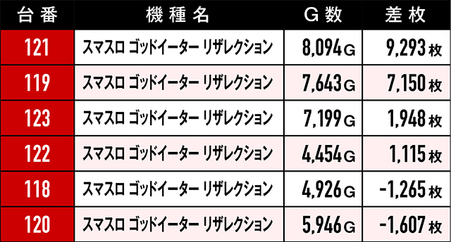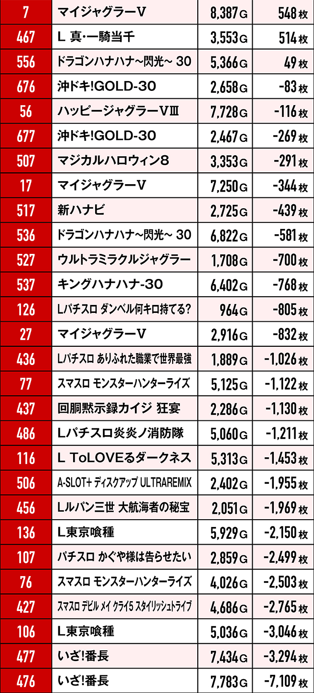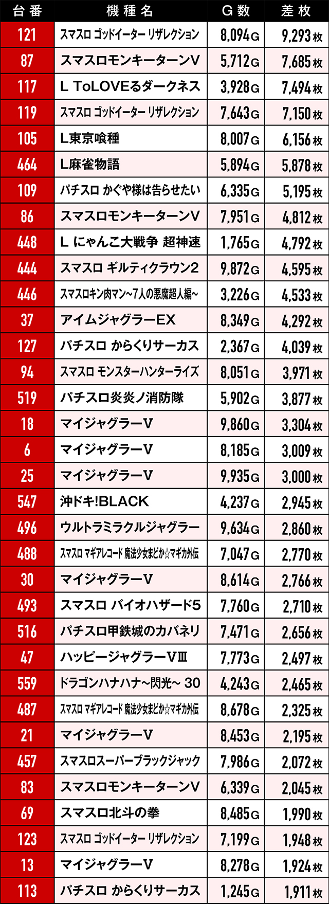 残念ながら初RED PLUS取材において、10,000枚オーバー記録が生まれることは叶わなかった。しかし大量のプラス差枚が誕生したのは事実。ご覧の通り、ありとあらゆる機種からプラス結果が出現し、これまでのRED取材の結果と比肩する数値がズラリと並ぶこととなった。