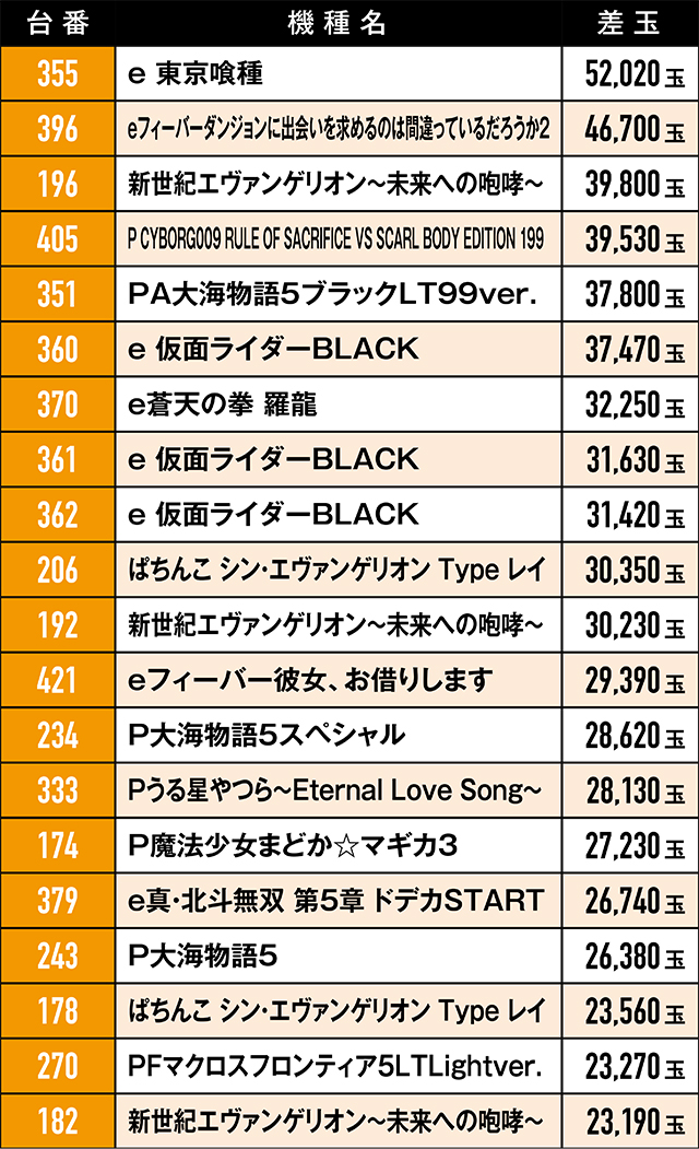 RED PLUS取材では、パチンココーナーの差玉結果にも肉薄!するとさっそくパチスロに負けぬ目の覚めるような結果が大量に現れた。TOP20記録はすべて20,000玉オーバーという無双状態。その熾烈な首位争いを勝ち抜いたのは、この日唯一の50,000玉超えを果たした『e 東京喰種』!