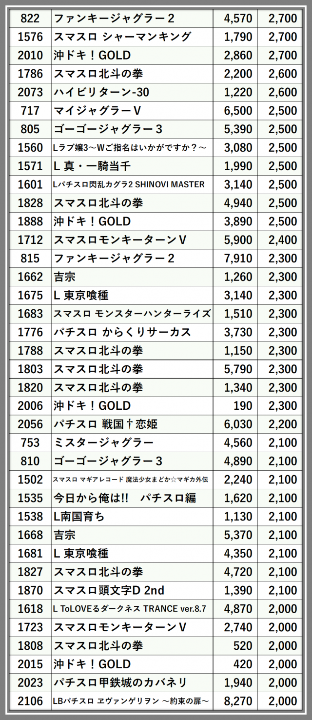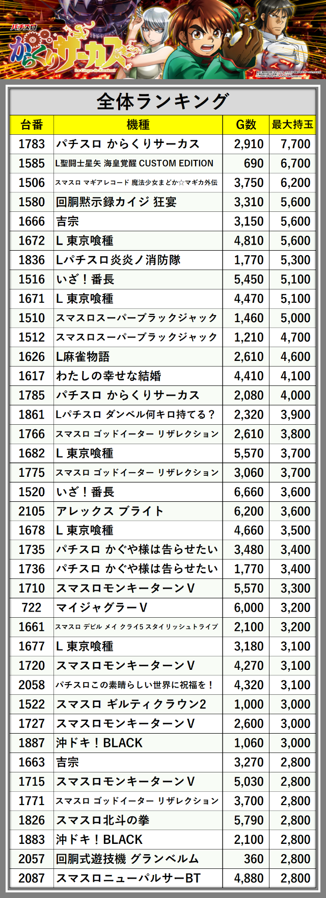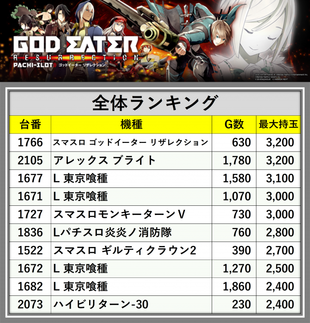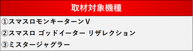 厳選された取材対象機種をはじめ、その他スロット全体から好記録が飛び出した!プレイヤーが楽しんだ1日を下記データにて振り返ってみて欲しい。