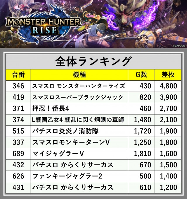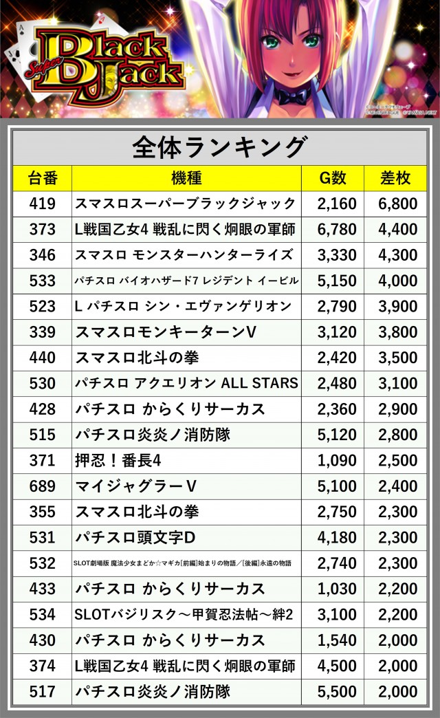 厳選された取材対象機種をはじめ、その他スロット全体から好記録が飛び出した!プレイヤーが楽しんだ1日を下記データにて振り返ってみて欲しい。