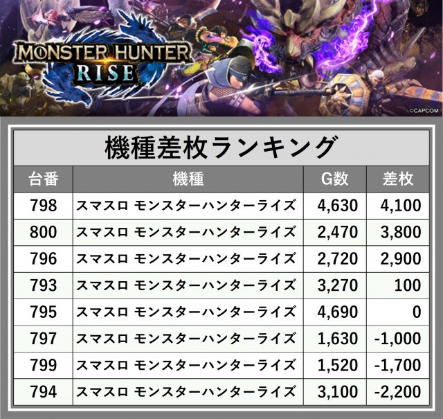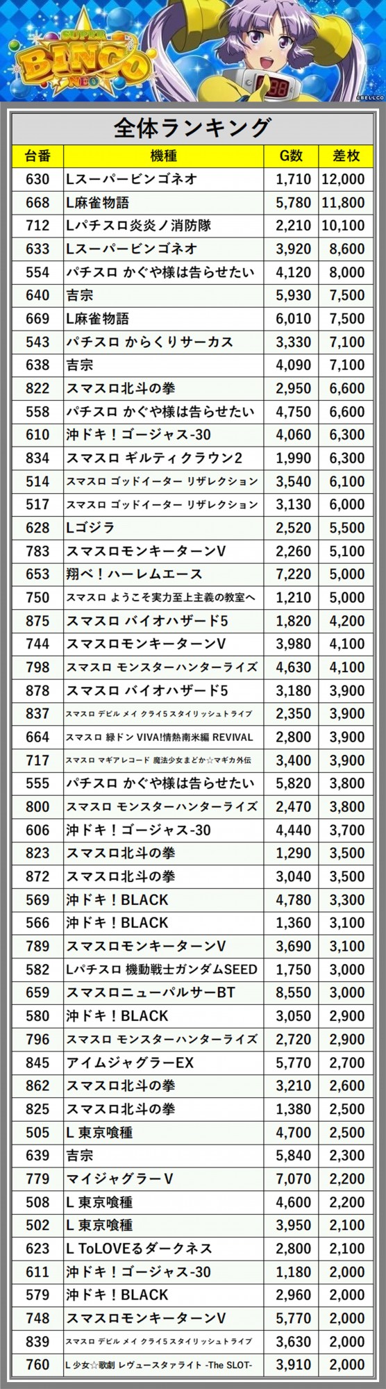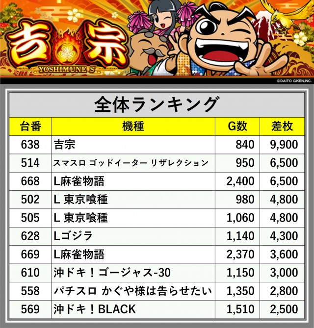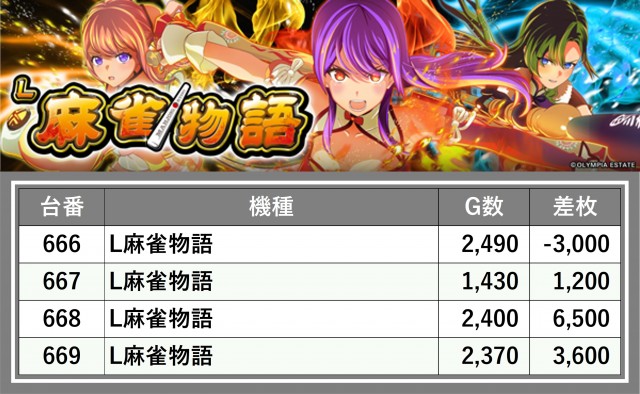 厳選された取材対象機種をはじめ、その他スロット全体から好記録が飛び出した!プレイヤーが楽しんだ1日を下記データにて振り返ってみて欲しい。