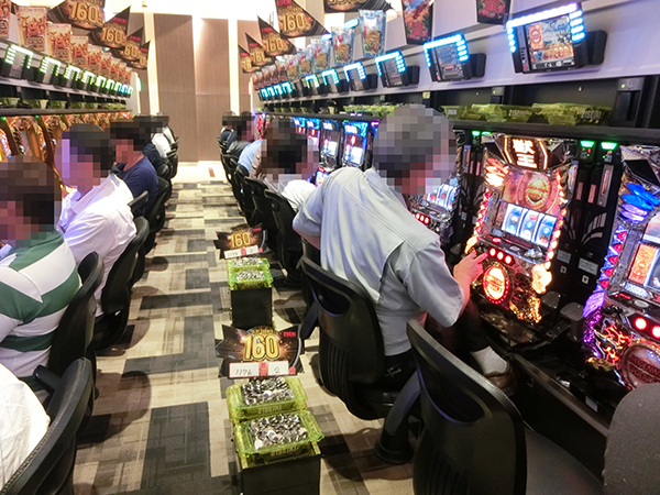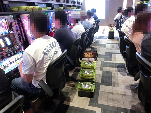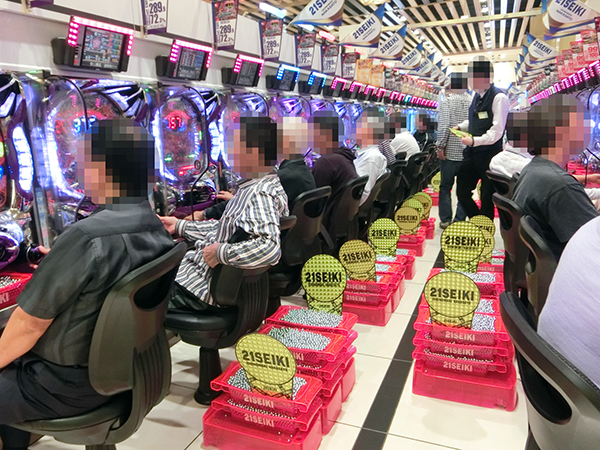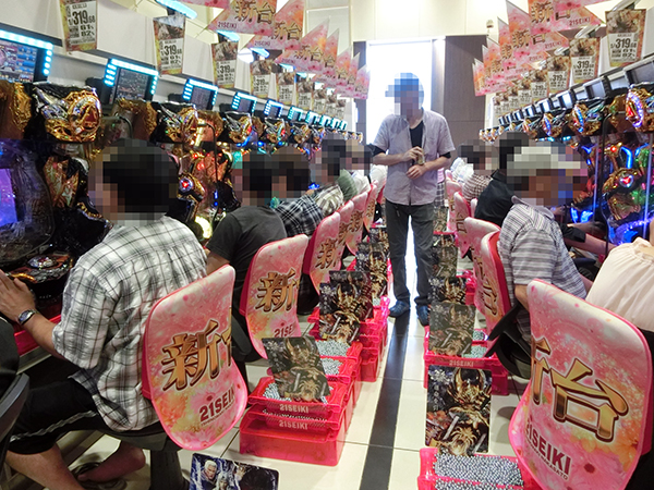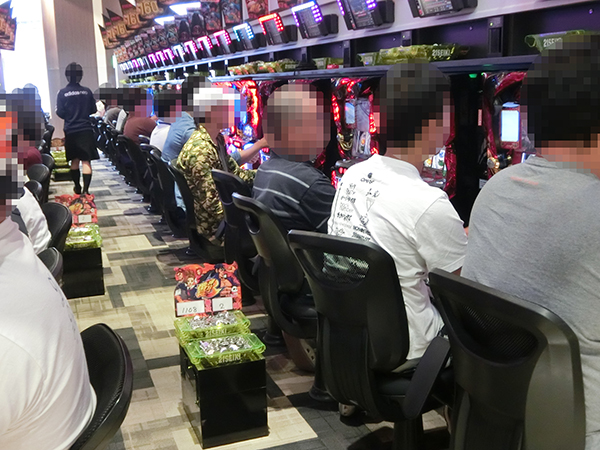 店内を見ると、あふれんばかりのプレイヤーが駆けつけており、パチンコ・パチスロ共にたくさんのシマから活気が感じられた。