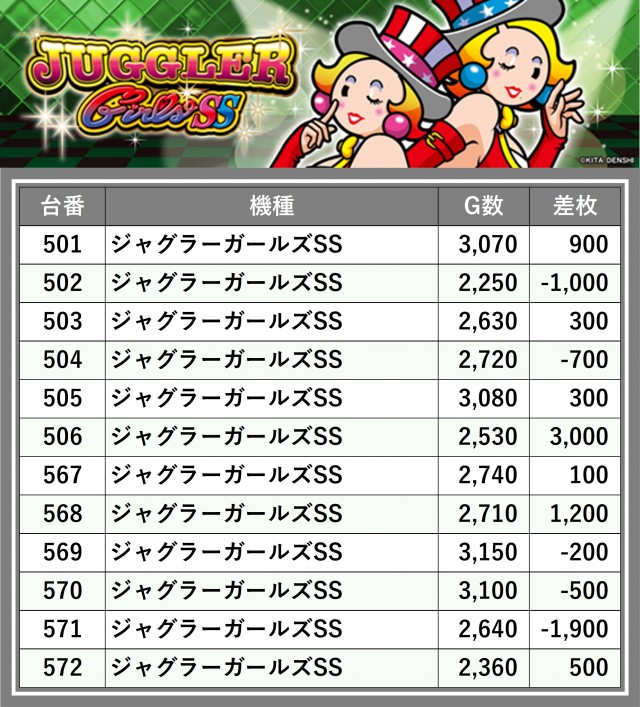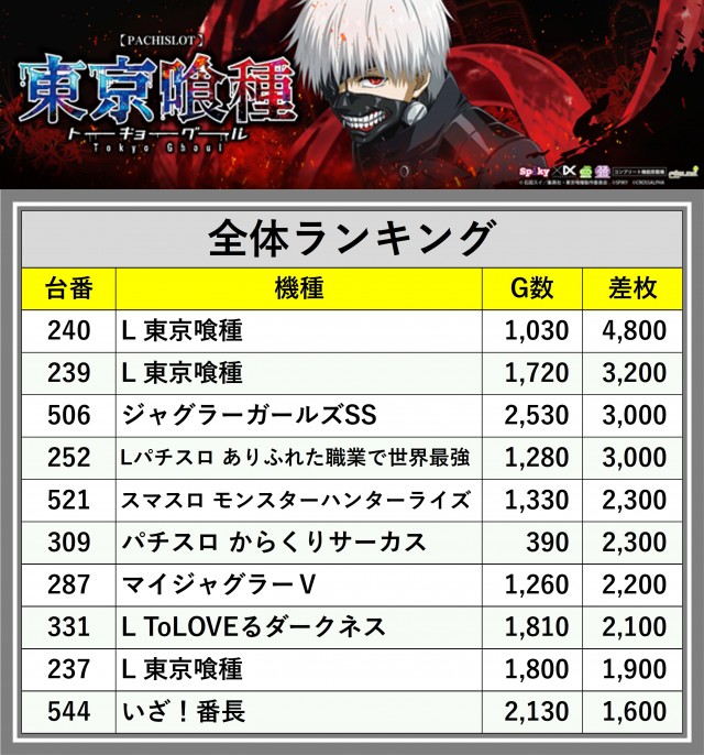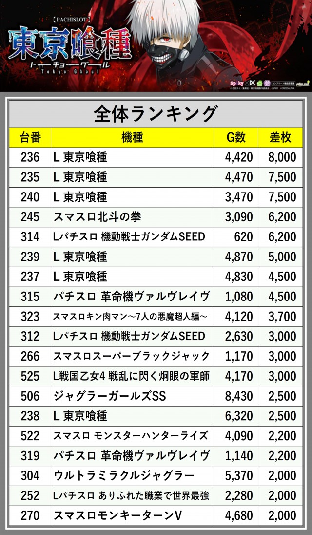 厳選された取材対象機種をはじめ、その他スロット全体から好記録が飛び出した!プレイヤーが楽しんだ1日を下記データにて振り返ってみて欲しい。