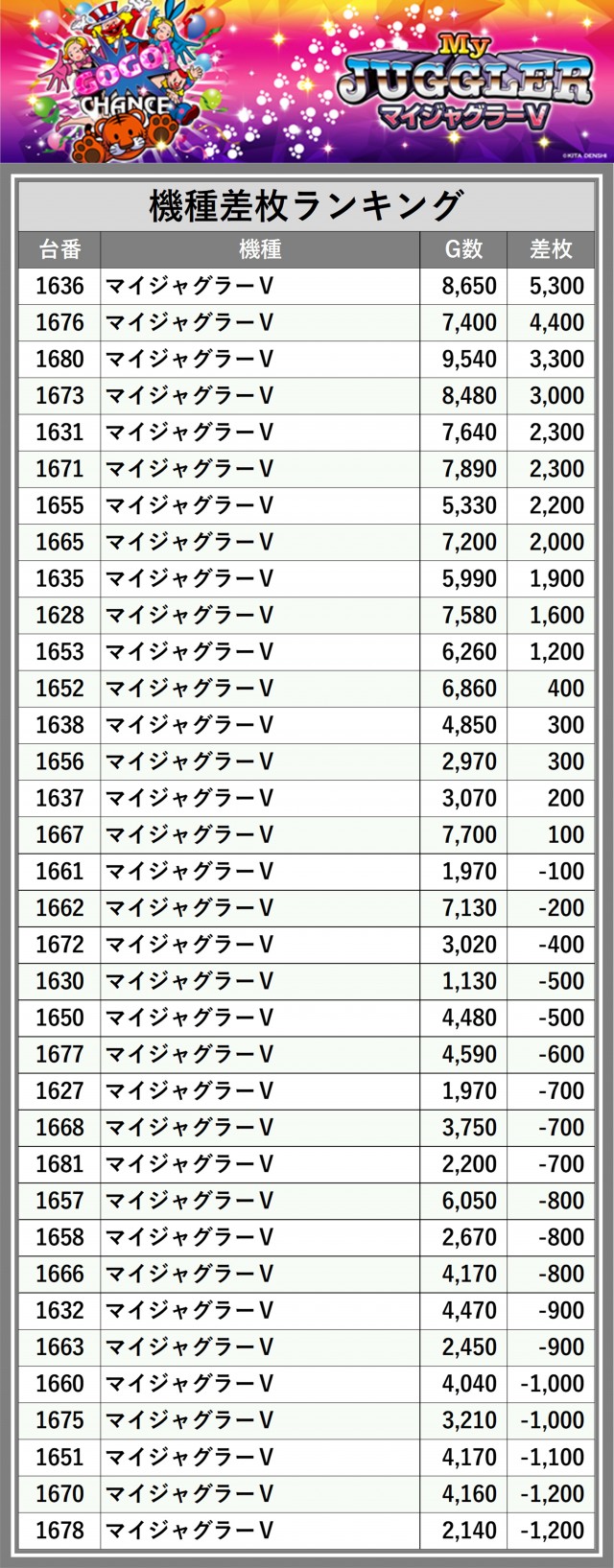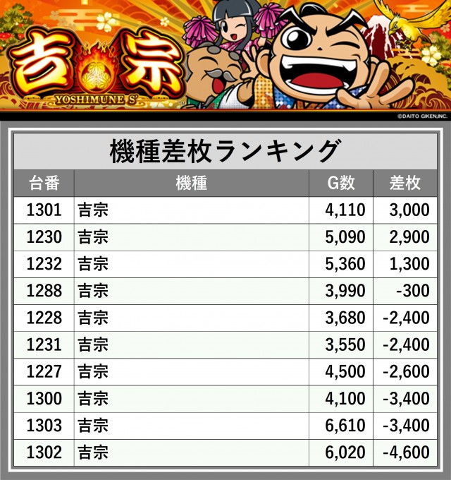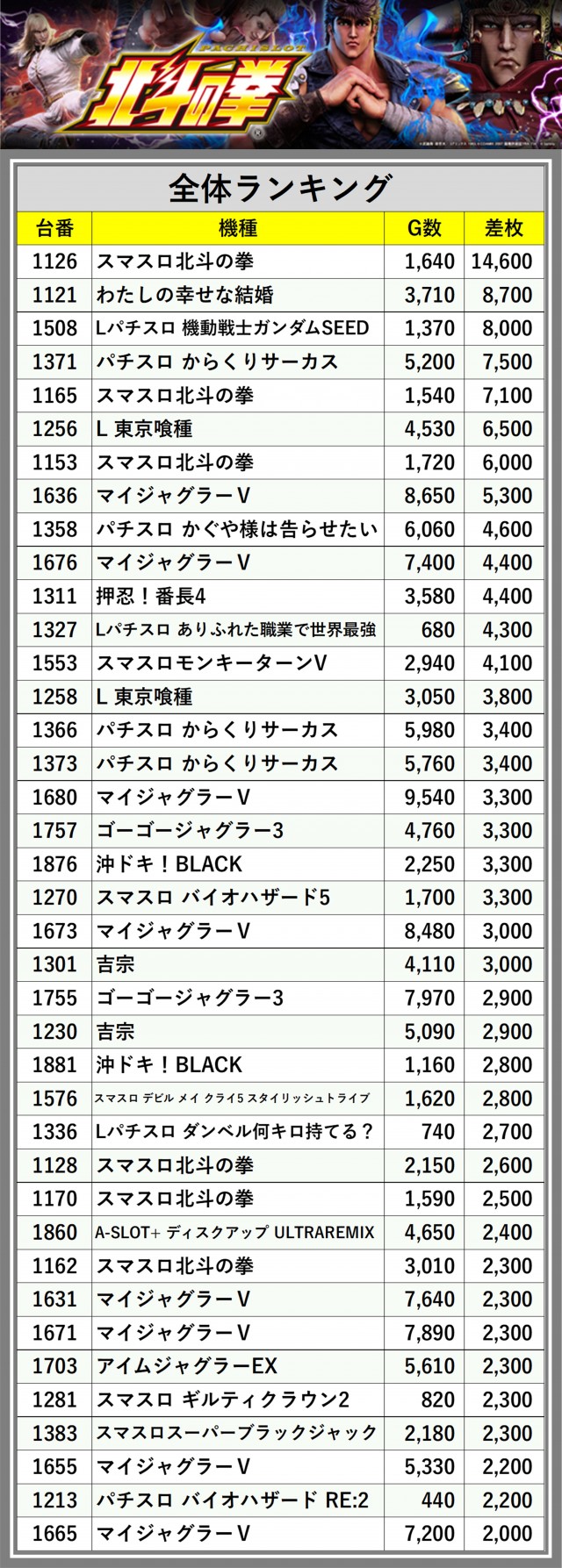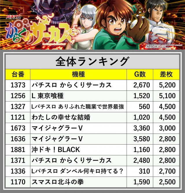 ※差枚数順に掲載しています
