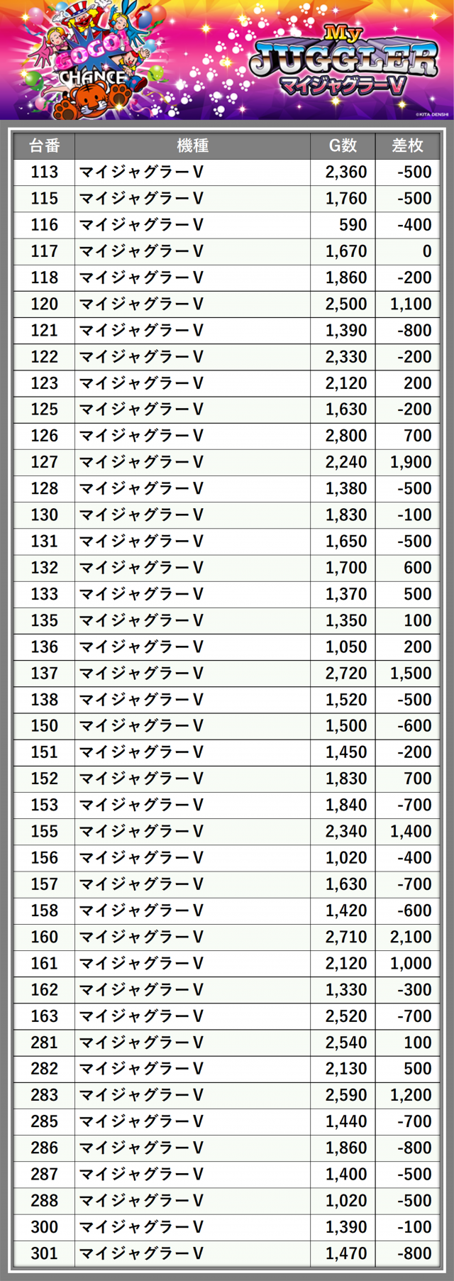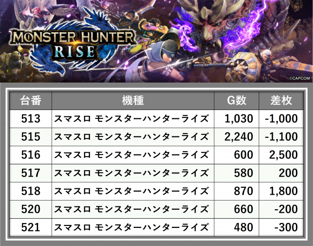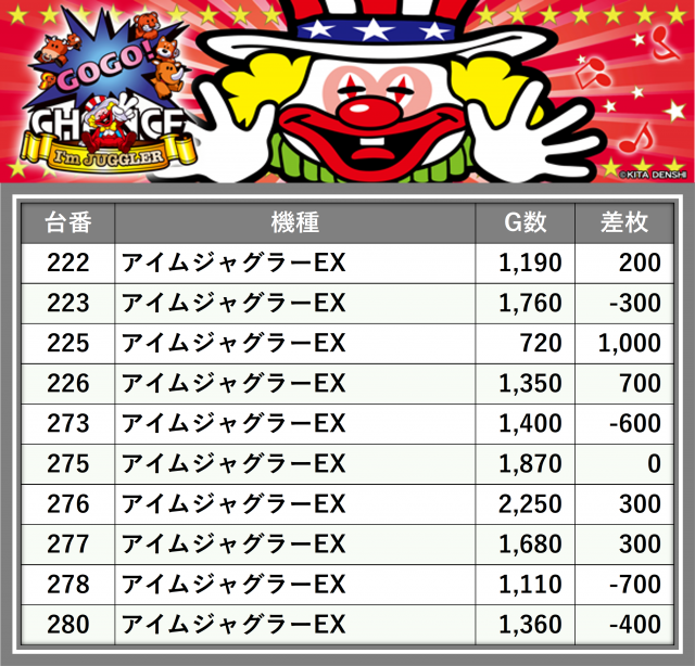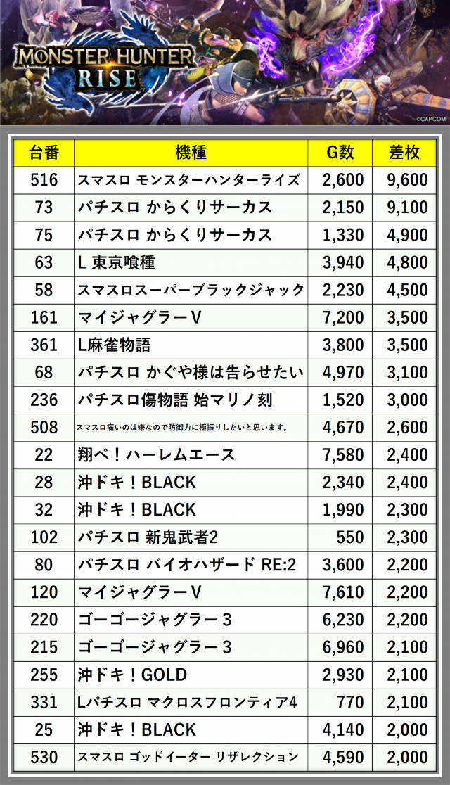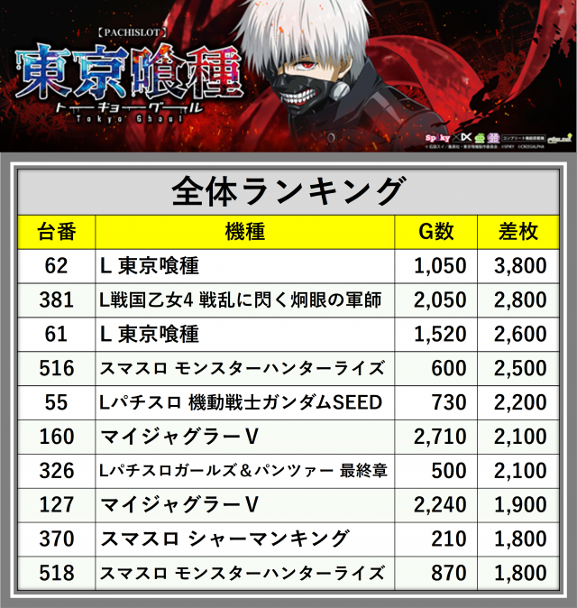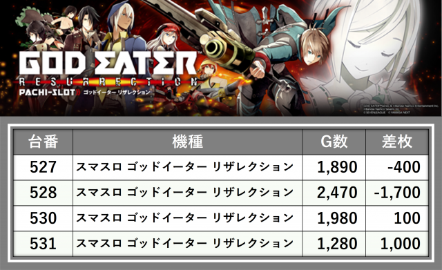 厳選された取材対象機種をはじめ、その他スロット全体から好記録が飛び出した!プレイヤーが楽しんだ1日を下記データにて振り返ってみて欲しい。