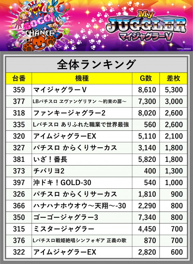 厳選された取材対象機種をはじめ、その他スロット全体から好記録が飛び出した!プレイヤーが楽しんだ1日を下記データにて振り返ってみて欲しい。